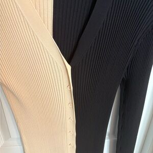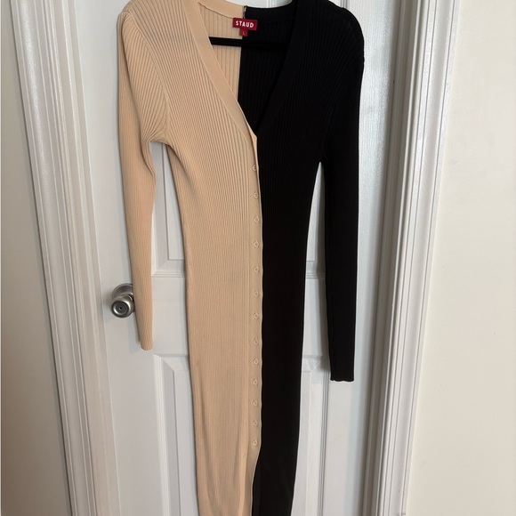 Stylish STAUD dress with a bold black and cream color block. Long sleeves and ribbed texture add elegance. Perfect for versatile wear. Excellent condition, one small pill in the back near the bottom of the dress as shown in photos. Size large