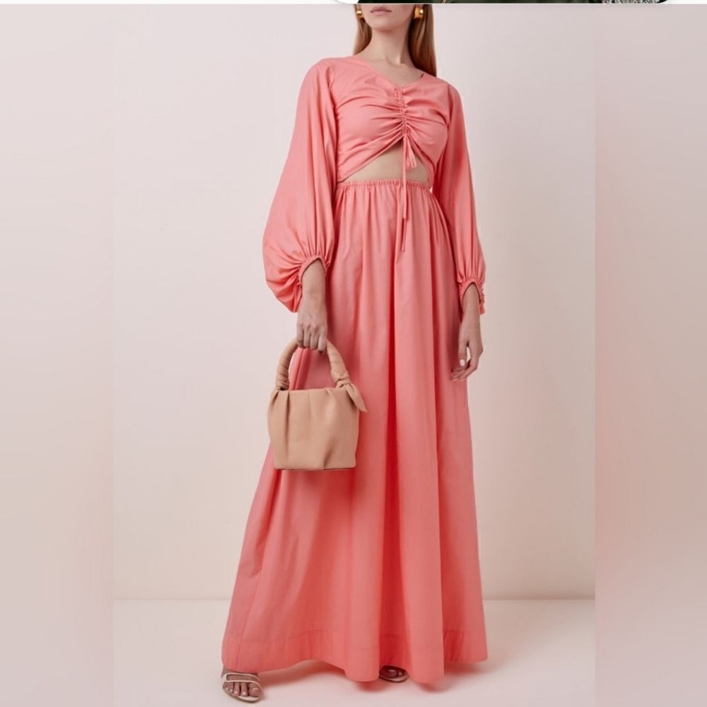 A-line maxi dress featuring a bold cutout front and adjustable ruching on the bodice.