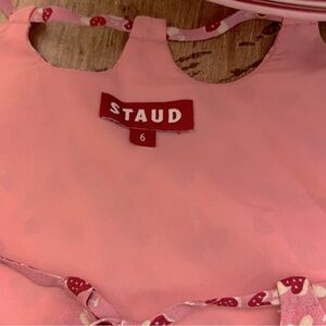 STAUD, PIPER DRESS in BLUSH MUSHROOM, “STAUD” Design/PRINTED Size 6 (MSRP$395) Side-Zip, Back Split, #mushrooms levate your look with this rare STAUD mushroom print maxi dress — a whimsical yet sophisticated design featuring delicate red mushroom motifs on soft blush pink. Cut with a flattering empire waist and flowy bell sleeves, this dress moves beautifully with every step. Scoop neckline with tie detail and charming keyhole cutouts at the back add a touch of modern romance. Hidden back zipper, full lining, and a back slit ensure comfort and ease of movement.