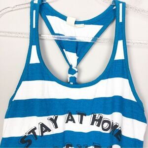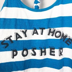 Adorable striped tank top by Beach by Exist. Sleeveless. Blue and white. Black graphic on the front that says Stay At Home Posher. Perfect for anyone who loves to buy or sell on posh!! Racerback with knot detail. Great condition! Womens size large.