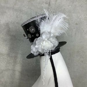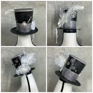 UNIQUE STYLES BOUTIQUE - New 2pc custom design one of a kind set bundle. Mini top hat black gray white silver blend tie with mixed metal beads pin steampunk gear removable clip on chain. Cap has feather floral white flower bling rhinestone diamond pearl charm brooch white fringe. Costume halloween renaissance Upcycle vintage festival fancy team duo couple. Very boho chic cosplay gypsy bohemian burning man Coachella vintage RebelsMarket The Pyramid Collection ** More Designs go to "brand" under "Unique Styles costumes"