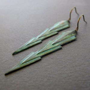 These unique earrings feature a triple triangle design in a chevron pattern made from brass and finished with a rustic green verdigris patina and hung from antiqued brass hooks, for a look that is both modern and vintage!