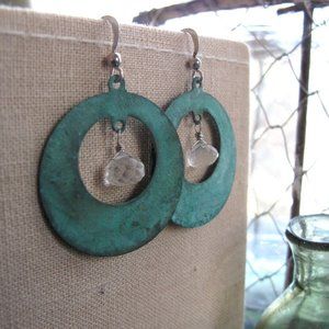 These simple brass hoops have been finished with a rustic green verdigris patina. The hoops are paired with brass ear hooks and genuine quartz crystal teardrops for an updated vintage look.
