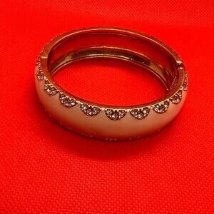 STELLA & DOT Cream Rhinestone Enamel Hinged Bangle Bracelet Chunky GoldTone