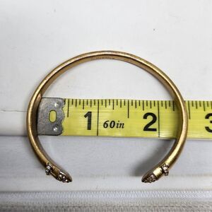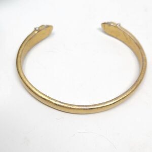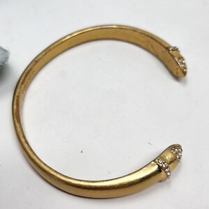 Gold tone cuff bracelet with rhinestone accents on each end. There is light wear on the finish. It measures approximately 2.25" across the center. Please see all photos as this is the exact item you will receive. Thank you so much for looking. I am always open to reasonable offers. Have a fantastic day.