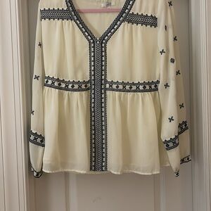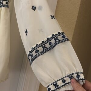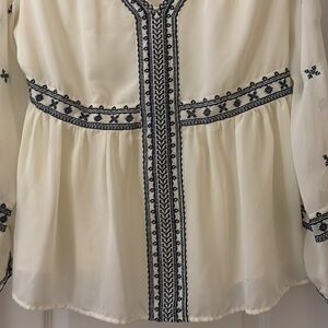 Elegant cream blouse with intricate navy embroidery. Perfect for a stylish and sophisticated look. No stains, no tears.