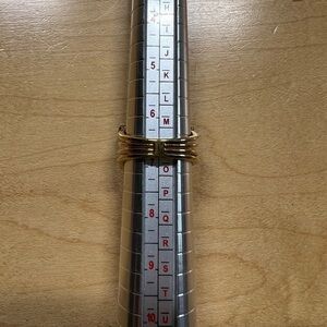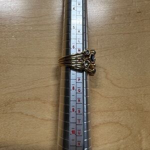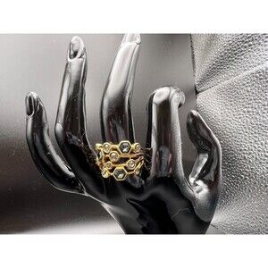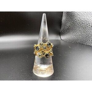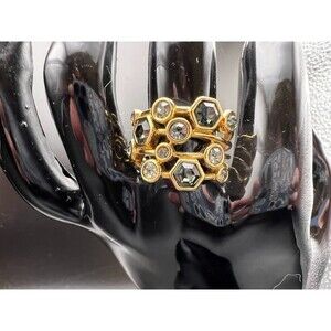 Stella & Dot bright gold metal ring with hexagon and circle crystals in shades of green.