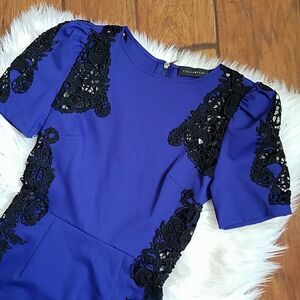 STELLA & JAMIE Blue and Black SS Lace Mini Sheath Dress with great stretch