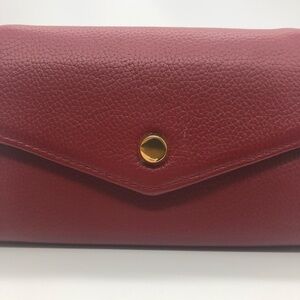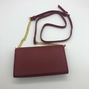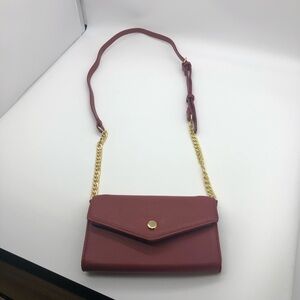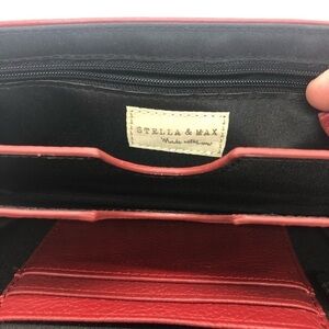 STELLA & MAX - PRETTY RED CROSSBODY PURSE - SHINY GOLD HARDWARE - 7” LENGTH 5” HEIGHT 2” WIDTH - 5 SECTIONS, ONE ZIPPERED, ONE POCKET THAT HAS 3 SLOTS AND 3 OPEN AREAS - STRAP CAN HANG TO 25” AND BE ADJUSTED SMALLER BY 5” - ONE SMALL INDENTION SHOWN IN PHOTO - EUC