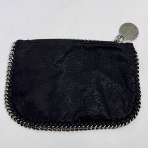 Details: STELLA MCCARTNEY vegan dear skin shimmery black Falabella pouch / clutch with silver Stella McCartney medallion logo, silver chain trim, fabric interior, and zippered closure.