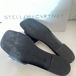 This listing is for a preowned 100% authentic STELLA MCCARTNEY Womens Black Chain Padded Falabella Square Toe Slip On Dress Sandals Shoes