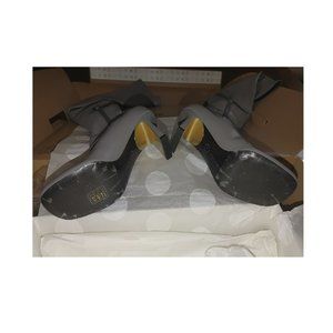Over-the-knee faux-leather boots in gray. Round toe. Half-zip closure at inner side. Silicone band at inner collar. Covered rectangular heel featuring gold-tone plaque at inner side. Tonal treaded faux-leather sole. Approx. 3 heel. Made from cruelty-free, non-animal materials.