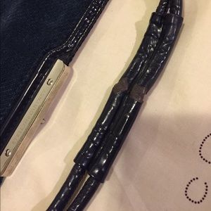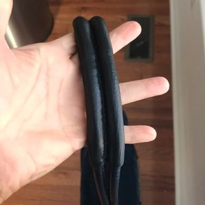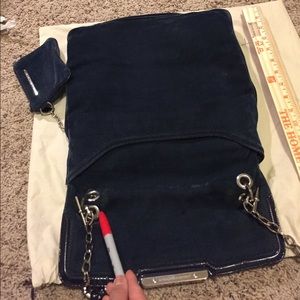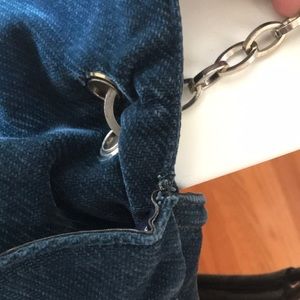 Deep dark teal, velvet like material. silver tone hardware. Minor wear on material where the flap folds & rubs unto the chain link (see pen). Temporary indentation marks on where the hardware pressed in storage. Zipped front pocket., back deep pocket has magnetic closure . Minor wear signs on side ends of inner opening, but nothing major. Lining is clean . Price reflects this imperfections . Strap has been repaired, handle wrapped with genuine pebbled black leather (see last picture).