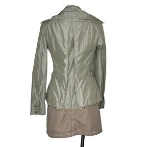 This is a great jacket, but it does have issues, so please be sure to read prior to purchasing or considering a purchase. None of the issues affect the wear. The original belt is missing. Personally, I would wear this without a belt, however, I am including a cloth belt that can be used, in a slightly lighter, beige tone than the jacket. You could also add your own funky belt to create a unique style. There are inner buttons and one of them is not the original cloth button but tha t’s on the inside and doesn’t show anyway. You can see that in the picture. There are button holes in the collars and so, either those buttons are missing or that’s just a style. I can’t imagine wearing this with those buttoned anyway. And finally, as you can see in the photo of the sleeves, each one has three buttons on the cuff, though there are four button holes. None of these things will make you look any less cute when you wear this jacket, and it gives you the opportunity to get a deal on it. Approx measurements, 18” underarm to underarm, 15” shoulders, a 25” sleeves, 24” long.