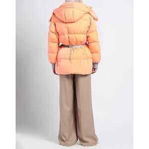 An oversized heavyweight, padded, and hooded coat featuring a turtleneck, long sleeves, full zip, multiple pockets. Belted with loops and a waist clip. It's labeled orange, but the color is more coral pink. Includes a brand logo and knitted trim cuffs. Comes with the original hanger.