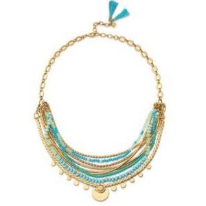 This attractive necklace is the best combination of gold and turquoise. It combines several strands of beads, discs and other glorious detailing. This statement necklace is perfect for adding boho charm to a simple sweater or t-shirt, but is also perfect for wearing with a suit for work.