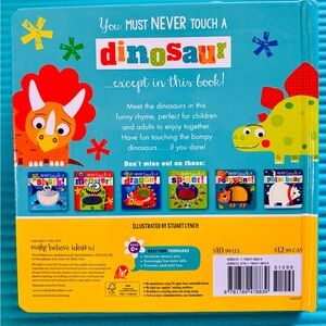 • “ Never Touch A Dinosaur “ sensory book Written by Rosie Greening (page shown in photo has a spot with damage but will not effect reading or play)