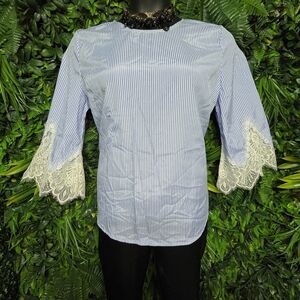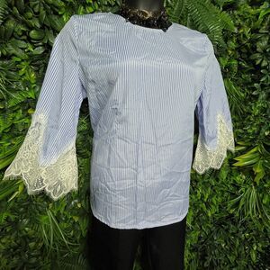 STEM & VINE Tops Women Medium White Blue Striped Lace Trim Sleeve 1622