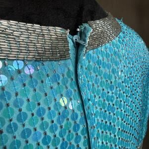 Gorgeous vintage Stenay cocktail dress in a vibrant turquoise blue with all-over sequins and silver beaded trim at the neckline, sleeves, and hem. This dress is fully lined, made of 100% silk with a polyester lining, and features a back zipper closure. A true statement piece perfect for parties, special occasions, or collectors of vintage beaded fashion.