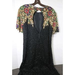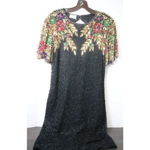 Vintage STENAY Silk Bead Sequin Pearls Dress Black Floral Leaf Gold Metallic