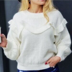 cream knit sweater features a fun ruffle detail, ribbed hemlines and fab sleeves.