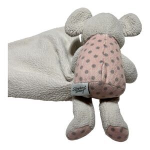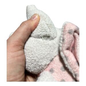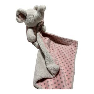 Elephant lovey/security blanket from Stephan Baby. Pink and gray polka dot blanket with white elephant. Preowned with some flaws - signs of wash wear and the seam at the bottom of the trunk has come open. Please see pictures.
