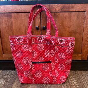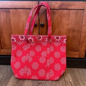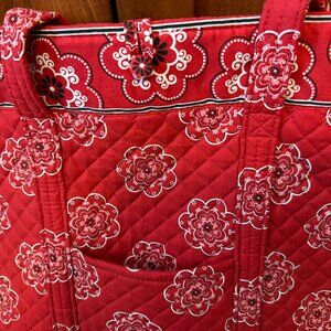 Stephanie Dawn Bag in America Red print. Outside has one slip pocket on the front and a slip pocket with a zippered pocket on the back. Interior has three slip pockets on each side. Lined with coordinating material. Measures approximately 18” x 15” x 6”. Button closure. Straps have a 10” drop. Like new condition. Smoke free/pet free. Please see photos.