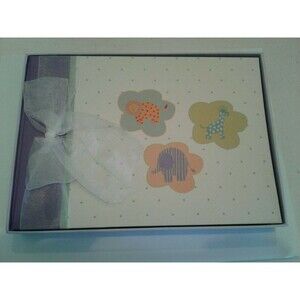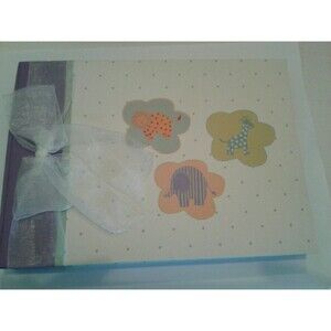 STEPPING STONES PHOTO ALBUM New in Box Bow & baby animals on cover 20 pages. New in box, never used. Price sticker residue on front box cover. Each page has different slots to fit photos into for different sizes. Measures about 8.5 inches long and 6 inches tall.
