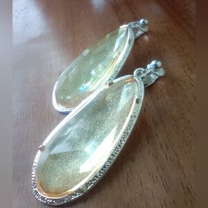 These elegant teardrop earrings feature a stunning gold hue encased in a sleek silver setting. Perfect for adding a touch of sophistication to any outfit this fall season.