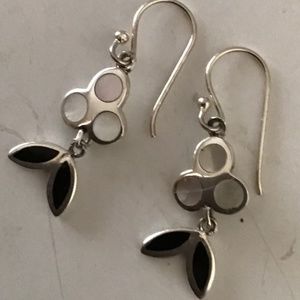 Marked 925. These 1” x 3/8” earrings resemble a flower with mother of pearl petals inlaid in silver and black enamel leaves inlaid in silver. The earrings are attached with French wires.