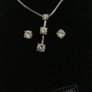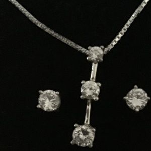 18” sterling box chain marked 925 Italy. 1” Slider pendant marked 925 with 3 round prong set graduated cubic zirconia. Earrings marked 925 including backs. Prong set round CZs same size as bottom CZ on the pendant. Total CZ pendant carats approximately 1-1.5 carats. Each earring is approximately 1 carat.
