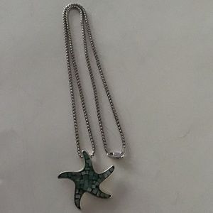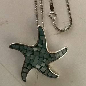 Brand new 19” sterling round box chain marked 925 Italy and signed GM. Pendant is 1-3/8” x 1-3/8.” White and grey shells inlaid on a green background in a sterling mount. Bale is hidden from view. Back is textured silver.