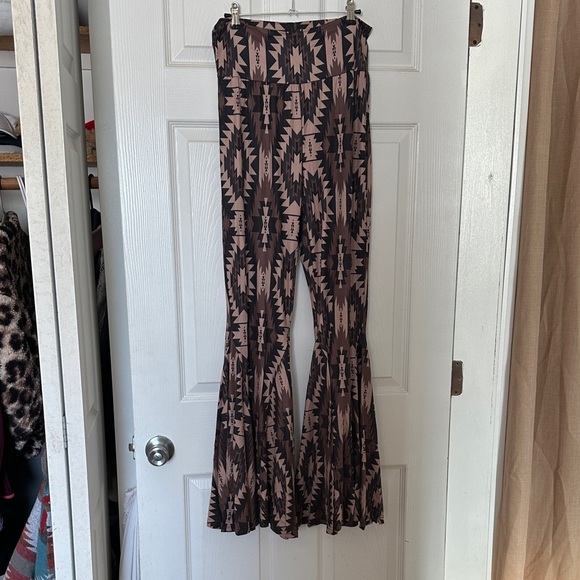 Stylish geometric patterned flare pants in black and brown. Perfect for a bold fashion statement. Size M but runs larger!