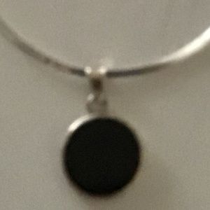 18” Clasp collar, approximately 1” diameter round black glass pendant. Marked 925, Mexico. Signed E-20 with a tiny bird symbol. 1.5” pendant drop, including bail.