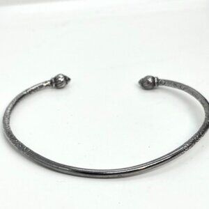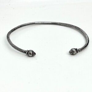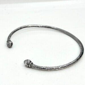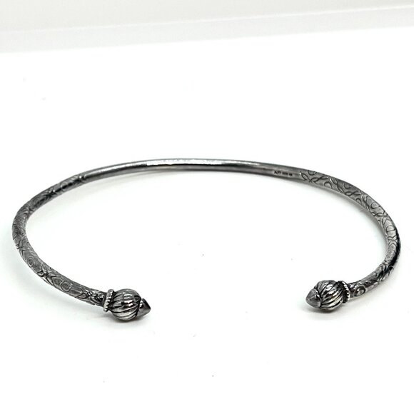 Beautiful sterling silver open cuff bracelet with an engraved floral and scroll motif throughout the band. The bracelet features decorative acorn style finials at each end and a softly antiqued finish that really brings out the engraved details.