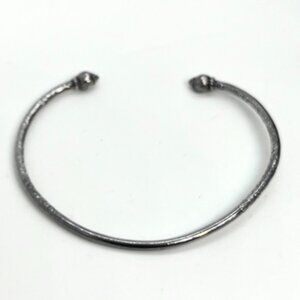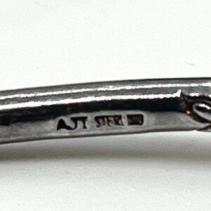 Signed AJ STER on the interior and tests as sterling silver. Measures approximately 8.75" inner circumference, 3" diameter, 1.5" cuff opening. Medium weight and comfortable on the wrist.