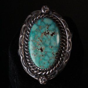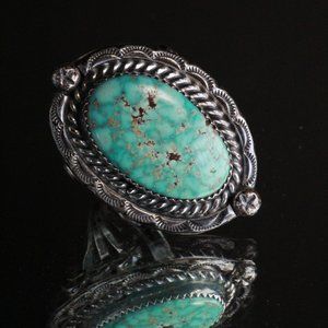 Handsome ring from The Navajo Tribe handcrafted from sterling silver bezel set with a beautiful 25mm by 16mm Carico Lake Turquoise. This piece is 17 grams and is marked KM. This ring is size 10 and in magnificent condition with beautiful tarnishing and patina.