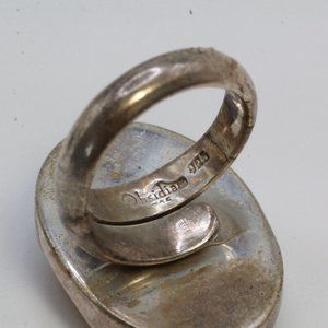 A one-of-a-kind piece! Featuring this split ring crafted from sterling silver band mounted with large oval shaped faceted obsidian druzy radiating gold and rainbow colors. This piece is in excellent condition and is slightly tarnished. This is size 9 and the face is 32mm by 22mm.