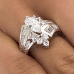 The ring is 3.20 TCW, high quality white sapphire, mounted in Sterling Silver. Beautiful