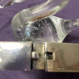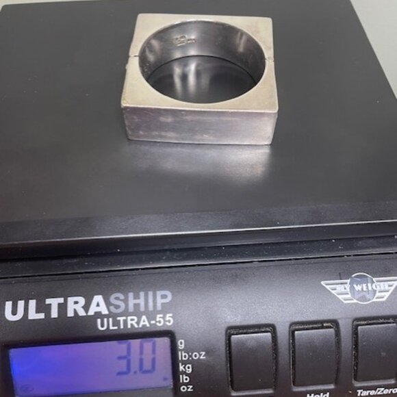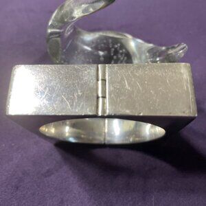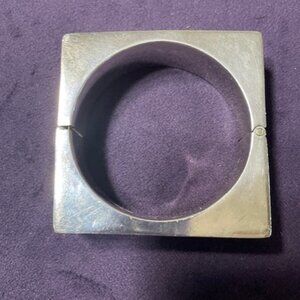 100% 925 Sterling Silver Bracelet that is square and 2.5 x 2.5 inches. The opening for your wrist is 2 inches. THE BRACELET'S WEIGHT IS 3 OUNCES OF 925 STERLING SILVER. It is in pre loved but good condition. Just needs a little shining up as Silver always does and I would recommend taking to a jeweler as I've never been happy with silver cleaning agents that are bought on the regular market. As you can see in the photo's it is on a hinge opening that works perfectly. Gorgeous Bracelet.