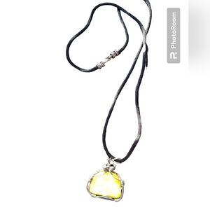 Beautiful sterling silver wire wrapped faux opal pendant on silk cord necklace with sterling silver hook closure. Necklace measures 26 inches in length. Beautiful one of a kind piece.