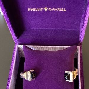 This brand new bangle is from Phillip Gavriel Italian Cable collection. This cuff bangle is made with sterling silver, accented with 18K gold and capped with pyramid-shaped black onyx gemstones on each end.