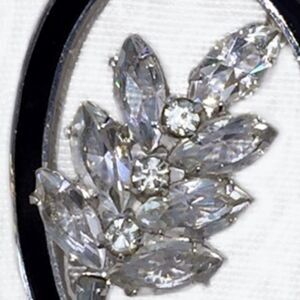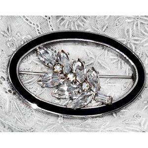BEAUTIFUL VINTAGE BROOCH/PIN CIRCA 1930’S. THIS FEATURES A OVAL SHAPE THAT IS IN BLACK ONYX ON A STERLING SILVER SETTING, IN THE CENTER FLOATING ARE A SERIES OF HAND CUT CRYSTAL MARQUSITE STONES ALL PRONG SET WITH 3 ROUND CRYSTALS AND A SMALL BAGUETTE STEM…THE STONES HAVE THE MOST AMAZING COLOR AND SPARKLE, THE PIN IS IN EXCELLENT CONDITION. , THE CRAFTSMANSHIP AND DETAIL ARE POSSIBLY EUROPEAN. 1.5” X 1".
