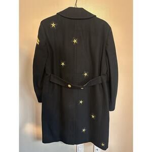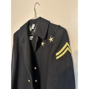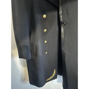 This unique black pea coat from Sterlingwear of Boston is a timeless piece that every man should have in his wardrobe. Customized by HBNelson Designs in Dublin PA. Made with high-quality wool outer shell material and nylon lining, it is not only stylish but also warm and comfortable to wear. The coat features a double-breasted design with 10 buttons for a secure closure and a mid-length fit that is perfect for both casual and formal occasions. Available in size 44S, this coat is a must-have for any fashion-conscious man who wants to stay stylish and warm during the winter months.