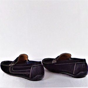 THESE HANDSOME BLACK FLAT-HEEL LOAFERS WITH CONTRASTING WHITE STITCHING BY STEVE HARVEY CELEBRITY EDITION, SIZE 7, are pre-owned, but in near-perfect condition, free of defects or damage, with no signs of wear. The uppers have the look of leather with a slightly distressed finish, but all materials are synthetic. The stated size is 7, but prospective buyers are encouraged to compare the measurements with those of shoes that they know fit well prior to purchase. Inside measurements are: length, heel to toe9 5/8" ; widest point 3"; narrowest point 2.25". Heel height is 1/2".