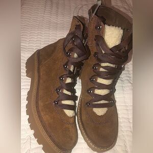 Stay stylish all winter long with the Steve Madden Rainier Cognac Suede Leather Lace-Up Platform Ankle Boots! Genuine suede leather shapes these classic boots that have a rounded toe and a lace-up ankle-high shaft with a pull tab at back. Contrasting beige faux fur accents the tongue. The chunky 1" rubber platform sole is decked out with silver studs, all atop a low block heel. 6" zipper at the instep.