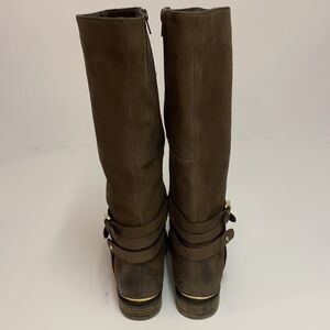 These boots are in excellent preowned condition. They are an extremely soft leather and a very comfortable. The color is a deep brown but it has a green tinge I believe.