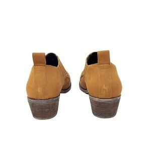 Pull on the Steve Madden Auckland booties for effortless style all season long! With a chic western boot design and soft nubuck, these leather ankle boots will add a trendy touch. Hidden Elastic side panels. Heel loop tab. Pointed toe. Leather and fabric lining. 1½" stacked block heel. Leather sole. Made in Brazil. Cognac color (slightly darker than photographed)