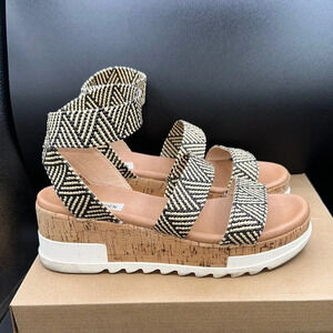 Elevate your style with these Steve Madden sandals, featuring a chic black and tan color scheme. The multiple straps and wide ankle strap offer a secure fit, while the thick platform sole and wedge heel provide both height and comfort.