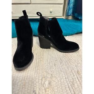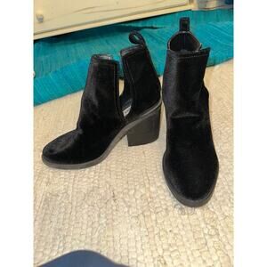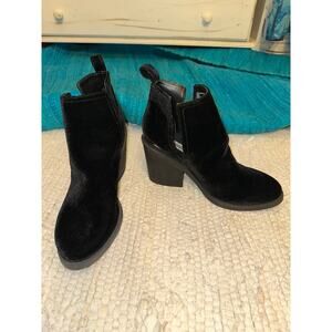THESE WERE NEVER WORN - JUST TRIED ON INSIDE. THEY ARE SIZE 8 BLACK VELVET ANKLE BOOTS FROM STEVE MADDEN.HEEL IS 3.5", SIZE IS 8. SUBTLY CUT OUT SIDES WHICH DIP TO ELONGATE LEGS. SILVER METAL DECORATIVE PLATE AT BACK OF EACH HEEL. THESE ARE SO VERSATILE -THEY CAN BE ROCK N ROLL OR CLASSIC - WEAR WITH JEANS OR A DRESS - CAN BE DRESSED UP OR CASUAL. BOOTIES, ANKLE BOOTS, DRESS BOOTS. I HAVE THESE LISTED IN BLUE VELVET AS WELL.